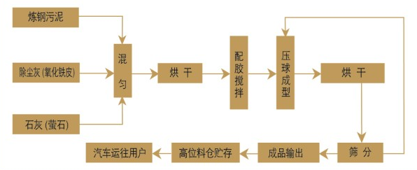 冷固球團(tuán)法是目前冶金企業(yè)進(jìn)行煉鋼污泥處理的主要方法。其工藝流程是: