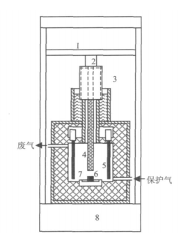 1.加壓橫梁 2.傳感器 3.密封裝置 4.壓桿 5.電熱元件 6.試樣 7.載樣臺 8.動力裝置