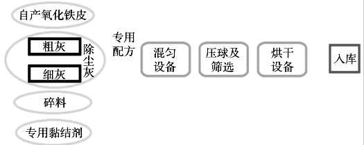 降低壓球含水量,提高壓球強(qiáng)度。黏結(jié)劑中可含部分增加冷固球團(tuán)強(qiáng)度、阻止黏結(jié)劑氧化且對(duì)鋼水成分不造成影響的無(wú)機(jī)物。工藝路線圖如下: